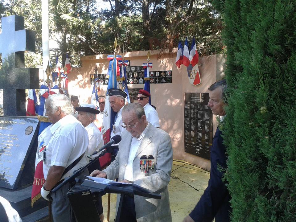 Lecture du discours d'hommage de Guy Vadon, concepteur du Mémorial de la Première DFL à Hyères les palmiers le 21 août 2015.